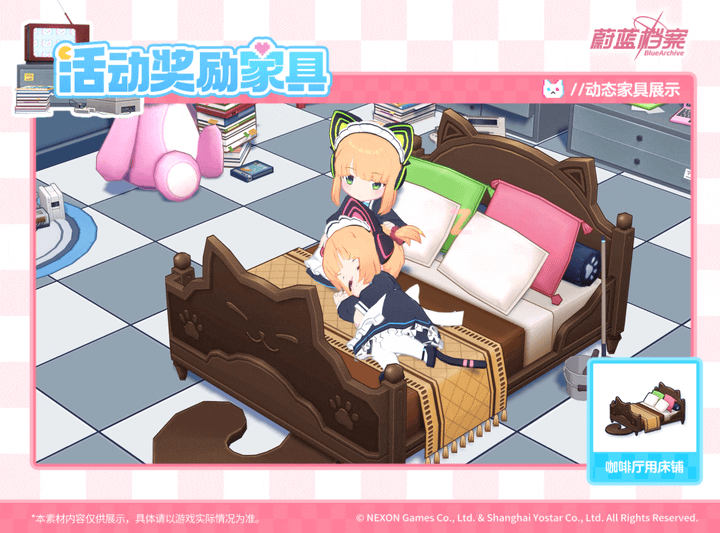 全新成员&家具互动动作即将更新!在咖啡厅配置“可互动的家具”后,当特定成员来访时,就会与家具产生交互动作!■ 更新时间11月06日 维护结束后■ 互动更新• 桃(女仆)&咖啡厅用床铺复古可爱风木雕床铺。传统但不古板的设计,可以卸下一切疲惫与烦恼。• 绿(女仆)&咖啡厅用床铺复古可爱风木雕床铺。传统但不古板的设计,可以装下一切睡梦与心事。• 桃(女仆)&绿(女仆)&咖啡厅用床铺不