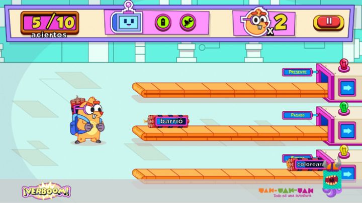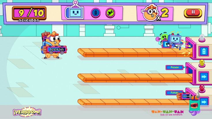 Ayuda a Dimitri Von Topo a desactivar la mayor cantidad de verbombas. ¡Actúa rápido! Desactivarlas colocando los verbos en los contenedores a los que corresponden. ¡Descarta los verbos que no corresponden con los tiempos verbales! ¡Verboom! es es:...