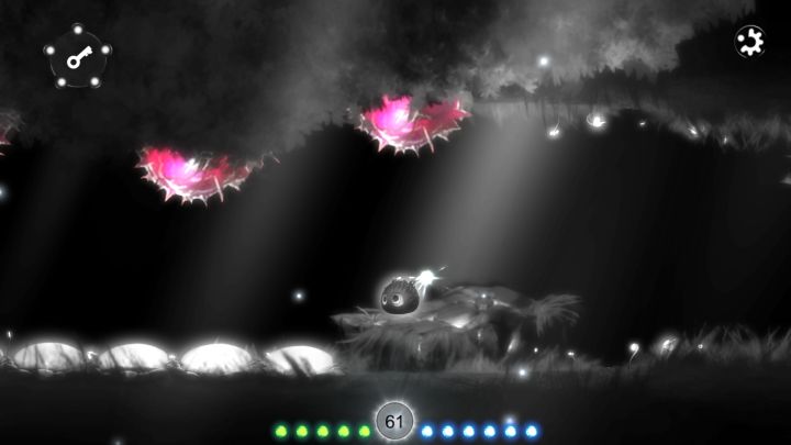 第一次做,试一试,嘿嘿。第一关出生地出来就是这个地方,右边走需要四段跳才能拿到阳光,所以往下走。往下走左边被封住了,只能往右走。到达这个路口。往下走。这个地方向下有一把钥匙,向上能拿阳光和钥匙,我们向上走。这个路口左边是一把钥匙,跳过去有花,向上走有阳光。这个地方就是阳光地开门,注意不能死,死了就要重新拿阳光。进去向下走到底,左边是盒子,右边有钥匙。往里走就有钥匙了。这些是第一