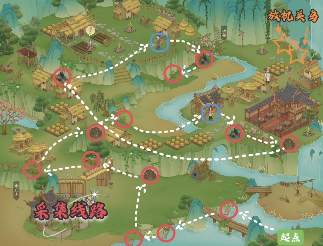 适合零氪或者没买机关鸟礼包,又想采村外的资源,买东西的时候还能顺手采集。 机关鸟4个,分别放在渔溪村右上角和青山镇的右侧的各2个资源点。 赤丘山,可以先走路线1,到最后一个矿的时候,点选中队伍,往太姥村去,采完太姥村,再点世界,乘鹤飞行回到赤丘山,走路线2。#桃源记2 #零氪攻略