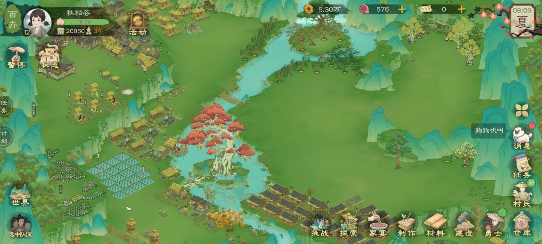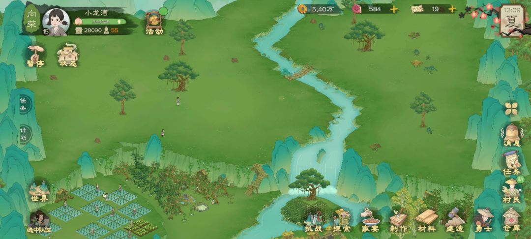 #桃源记2 # 内容:1.食物:初期采集桃树,野菜和浆果,桃子有生长时期,过了生长期就无法采摘。野菜可以的话建议留一下,开始种田后第一个作物是小麦,需要处理成面粉,再和野菜一起做成野菜面。田要安排村民管理,一人可以管4块。研究水稻了就种水稻,水稻不用配菜。 2.衣服:基本没有制作的必要,就算有衣服村民也会三天两头的生病,而且采集制作材料会拖进度,所以多备药比较好。 3.资源:茅草、石头、木头