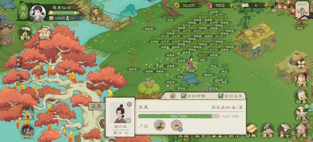 游戏中自动采集,采集浆果啥的选一两个人就行了,他不仅会采你点的那个,全地图的都会跑着去,桃子啥的也这样放一两个人就行了