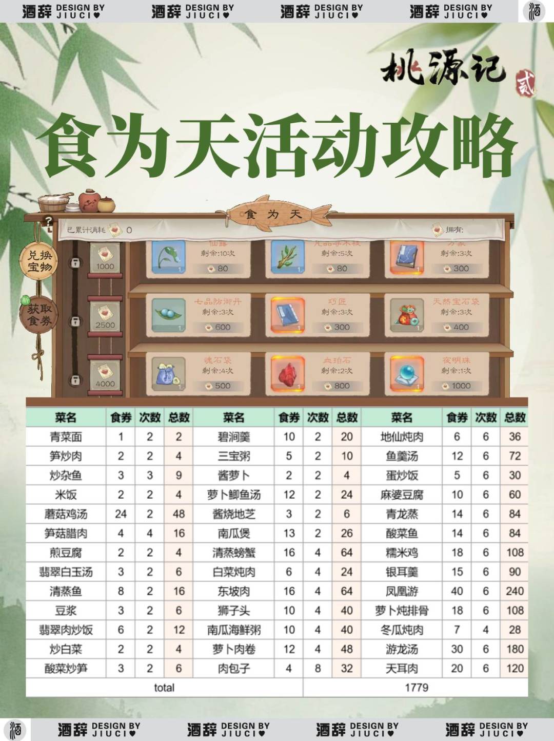 食为天活动攻略来了! 这是一个周循环活动 建议大家攒一攒一口气冲进去比较划算 以兑换夜明珠为例子 大约需要3周时间可以攒齐食券 如果参加桃花鱼活动可能还能快点[捂脸R] 区服:1区-桃源野谷,游戏UID 1014478 #桃源记2攻略布局大赛 #桃源记2 #桃源记2攻略