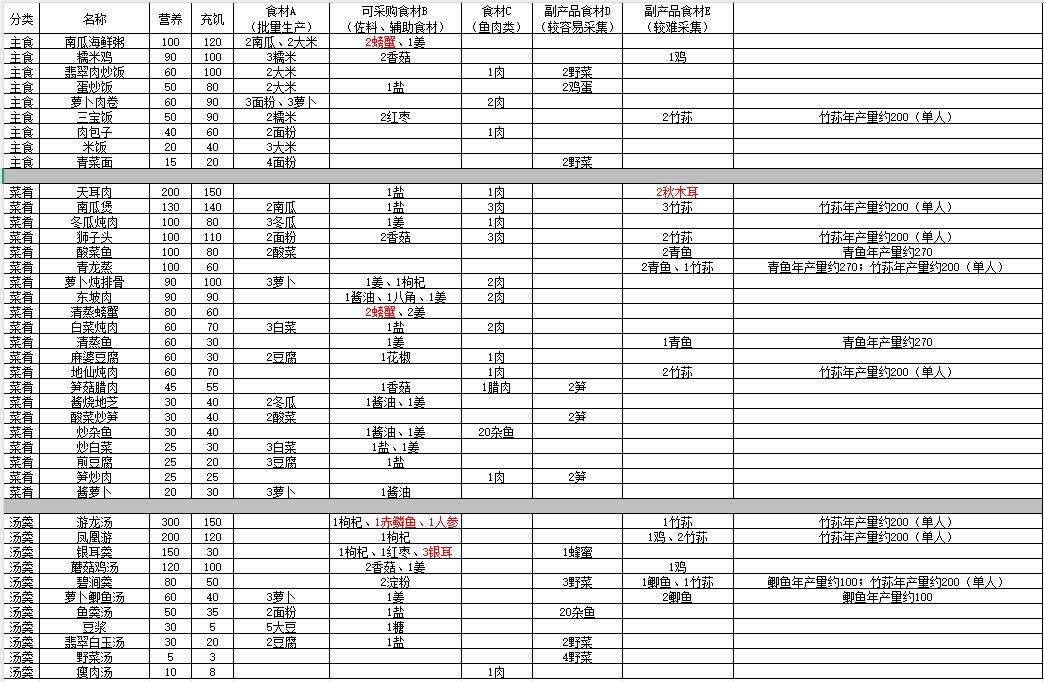 先简单解释下这张表,我把食材分成了5类,A是可量产类,B是可采购食材,C是杂鱼,肉类,D是副产品食材,E是较难获取食材,这是为了后面比较各类食物的性价比。而最右侧那一列,是对E类食材获取的注释,其中青鱼和鲫鱼产量固定,基本就是270和100,而竹荪取决于你有多少竹子,比如我现在15棵,有点无法满足3个人不间断采集,那我一年的竹荪产量大概只有550-570,这个根据个人情况的不同,你们大概估计一下就