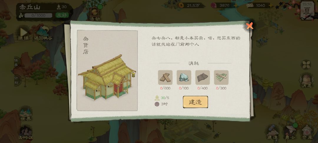 升到12级后会解锁赤丘山任务,先带队去渔溪村,从渔溪村左下角去赤丘山,打败四个怪兽,下一步任务是修建赤丘山的三个建筑,分别是: 【杂货店】【丘师父家】【声望铺】 共需要材料如下: 硬木板1800 青石块300 粗瓦1200 竹条900 提前准备好材料,从桃谷运过去,做任务就不慌啦~#桃源记2 #桃源记2攻略 #桃源记2难度