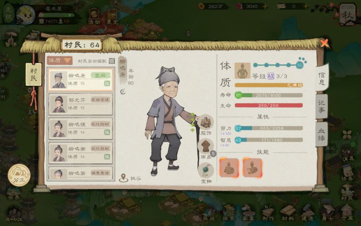 宴会有300加寿命经验,检的流民有60寿命以上就可以结婚,后代61寿命是1500经验,过5天就是6岁寿命就61了,2是2500,吃够40岁晚婚晚育,基本出生的小孩都是65寿命,宴会都吃有300以上,基本都是能活到70退休的