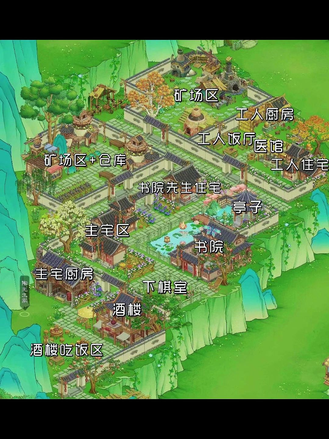 序 青崖叠翠,溪绕庭前,白墙黛瓦藏于山水之间,是为陶家庄。庄内有矿、有院、有书声、有烟火,劳作与风雅共存,生计与温情同在,自成一方天地。 一【陶先生·青崖一园烟火】 我是陶渊,立庄于此已数载。 旁人只道这是避世山居,我却知,这山庄是数十户人家的安身之所。天未亮,矿区已闻锤声,风箱吐火,矿石成山,那是庄中生计根本。我设仓房、建工人住宅,开饭厅、立医馆,使出力者有饭,伤病者有药,不必流离。 庄中不止烟
