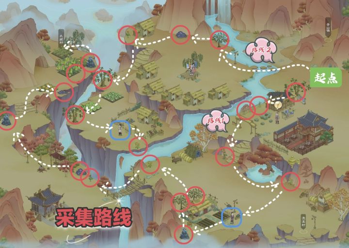 适合零氪或者没买机关鸟礼包,又想采村外的资源,买东西的时候还能顺手采集。机关鸟4个,分别放在渔溪村右上角和青山镇的右侧的各2个资源点。赤丘山,可以先走路线1,到最后一个矿的时候,点选中队伍,往太姥村去,采完太姥村,再点世界,乘鹤飞行回到赤丘山,走路线2。#桃源记2 #零氪攻略