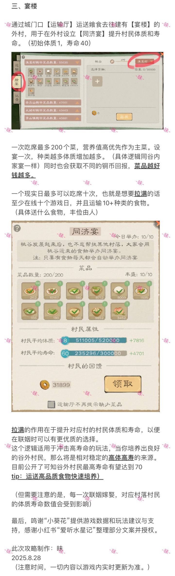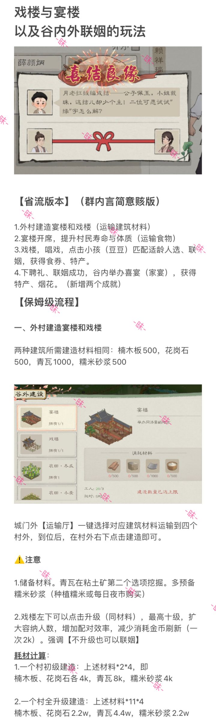 ——————9.1更新最终版本———————9.1更新,修改青山镇bug。【最终联姻版本总结】送人去村外获得5食券(十次)接人回村里获得对应特色菜品可以兑换食为天获得食券(每个村子两次)【省流版本】(群内言简意赅版)1.谷内和外村建造宴楼和戏楼(运输建筑材料)2.宴楼开席,提升村民寿命与体质(运输食物)3.戏楼,唱戏,点击小孩(豆豆)匹配人、联姻,获得食券、特产。4.联姻成功,谷