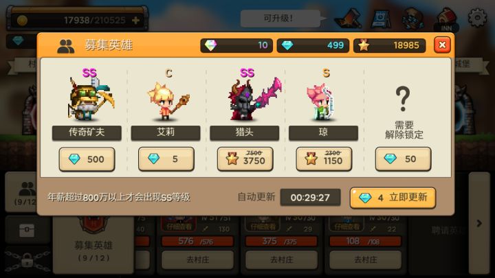 1,箱子。装备栏留两个空捡箱子就行,木的不捡,蓝的捡了时间开,红的广告开,白的时间开。8小时一个免费白箱子,记得领。2,英雄。a矿夫,a白银骑士,a传感器,a奥利维亚都不错,可以拿来过渡。bc没必要买,平均a+2了之后开始琢磨升级成ss或s,矿夫有送不用花钻。3,钱。先升英雄后升装备,技能里可以升收回回血和加攻击,其他需求不大。4,钻石。先升auto,再适当开装备栏,村子任务栏可以开一个,1
