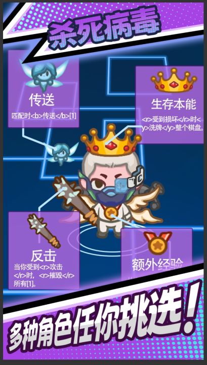 病毒无时无刻都在入侵我们的身体,危害我们的健康,你的角色是一个守卫健康的卫士,要抵挡各种各样的病毒入侵并消灭他们,病毒靠近你时会攻击你,所以要在他们靠近你前尽量的消灭他们。