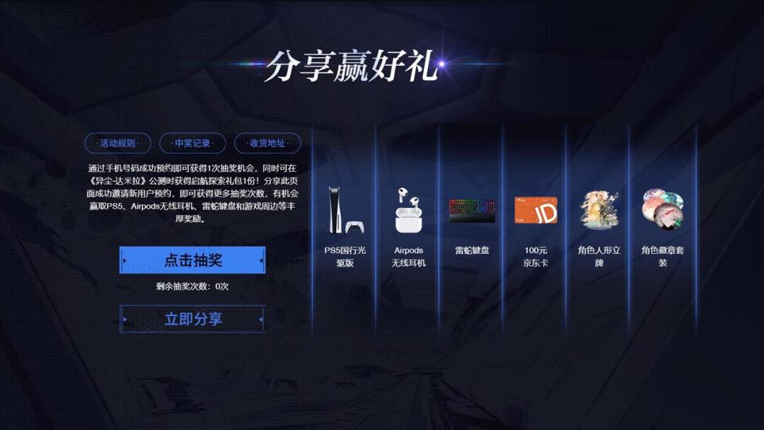 一、活动时间 2023年6月15日—2023年8月3日 二、活动规则 1、抽奖次数和礼包获得:活动期间,在本页面使用手机号码预约游戏即可获得《异尘-达米拉》启航探索礼包及1次抽奖机会,分享专属链接给未预约过游戏的新用户,对方通过链接预约后即可额外获得1次抽奖机会,通过分享获得抽奖的次数上限为9次。即每位用户最多可获得10次抽奖机会。 2、抽奖活动:活动期间,您可以在本活动页面参与抽奖,抽奖结果即时