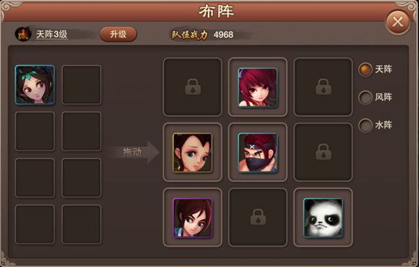 布阵是九宫格玩法中最核心的部分。玩家通过调整主角与伙伴上阵的不同位置,在战斗中对胜负至关重要。 玩家要根据对手的布阵以及根据我方人物特性进行不同的布阵,最终达到获胜的目的 《神仙道高清重制版》在之前的基础上对布阵系统进行了一定的优化。 在本作中,玩家布阵时需要先选择一个阵型,每个阵型会开放最多5个空位,玩家可在这5个空位中自由选择角色的站位。同时,每种阵型对于阵上角色的增益效果也是不同的。 天阵可