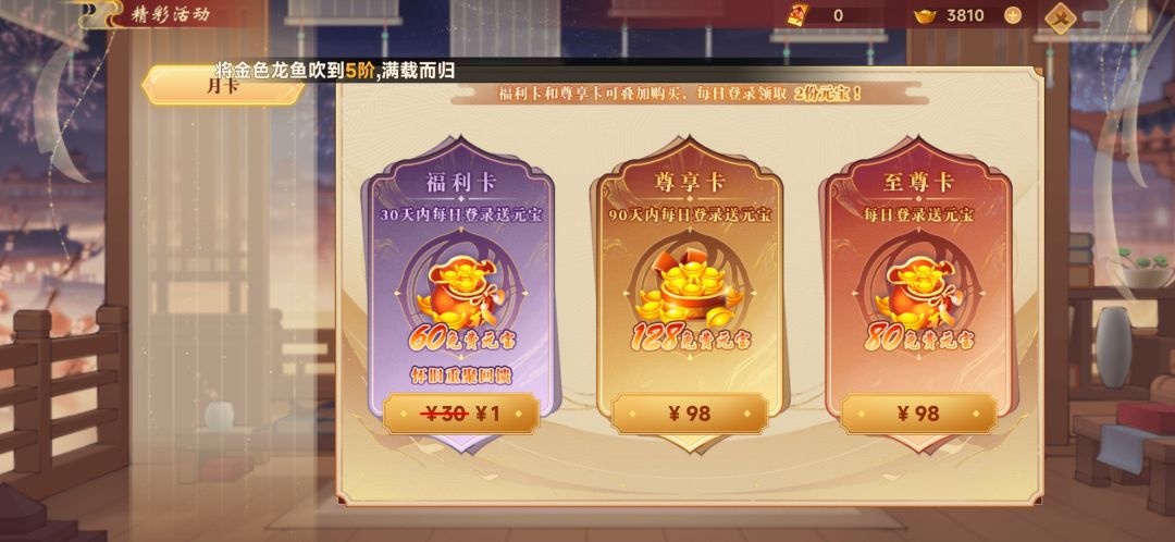 由于现在是开服前期月卡现在有折扣,1元月卡随便买,60*30元宝,这个首买,由于福利卡只能买一次,至尊卡是每天都有80*n元宝,对比尊享卡的128*90的性价比还要高一点,月卡党首选福利卡>至尊卡>尊享卡。 首充福利等于每档金额都是冲多少送多少,大家不要误以为是只可以享受一次双倍元宝活动,虽然说送的是免费元宝,但是这个返利活动只有一次,也就是各个档位的返利可以有一次机会,如果要氪金的话建议按照这个