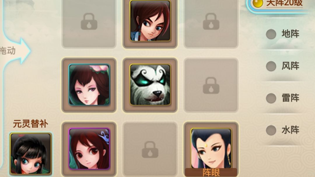 布阵是九宫格玩法中最核心的部分。玩家通过调整主角与伙伴上阵的不同位置,在战斗中对胜负至关重要。 玩家要根据对手的布阵以及根据我方人物特性进行不同的布阵,最终达到获胜的目的 《神仙道高清重制版》在之前的基础上对布阵系统进行了一定的优化。 在本作中,玩家布阵时需要先选择一个阵型,每个阵型会开放最多5个空位,玩家可在这5个空位中自由选择角色的站位。同时,每种阵型对于阵上角色的增益效果也是不同的。 天阵可