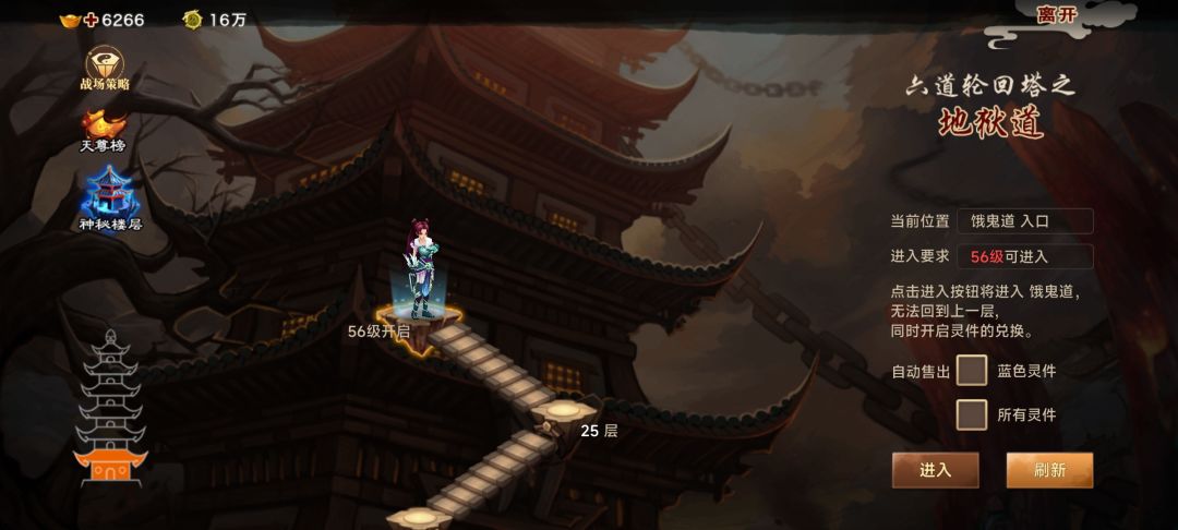 六道轮回是《神仙道高清重制版》中证明自身实力的特色PVE系统。 玩家在通过封曜之窟(1)之后即可开启六道轮回系统。 六道轮回是非常经典的爬塔系统,玩家依靠自身实力挑战每层的怪物获取奖励。奖励包括经验及封灵。 封灵可在装备强化中提升装备的属性,并改变装备的造型。 六道轮回共有六道,分别从低到高为地狱道、饿鬼道、畜生道、修罗道、人间道、天道。每一道均有不同的开启等级需求 每一道都有25层关卡,每5层一