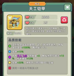 主公们好呀~小编今天来带大家了解下游戏中的每个装备都有他的特殊品质技能,而且装备还能通过升级来提高属性与解锁品质技能,下面我们来对一部分的装备进行讲解! 一、衣服 1.新手的玩家们都会对于战神铠,情有独钟,因为拥有复活效果,但是现在每个s级衣服都拥有复活效果,而且都比战神铠效果好,所以现在并不推荐大家选择战神铠,其他三件衣服都比战神铠好用。 2.不过可以用战神铠来过渡,因为战神铠拥有的效果其他的三