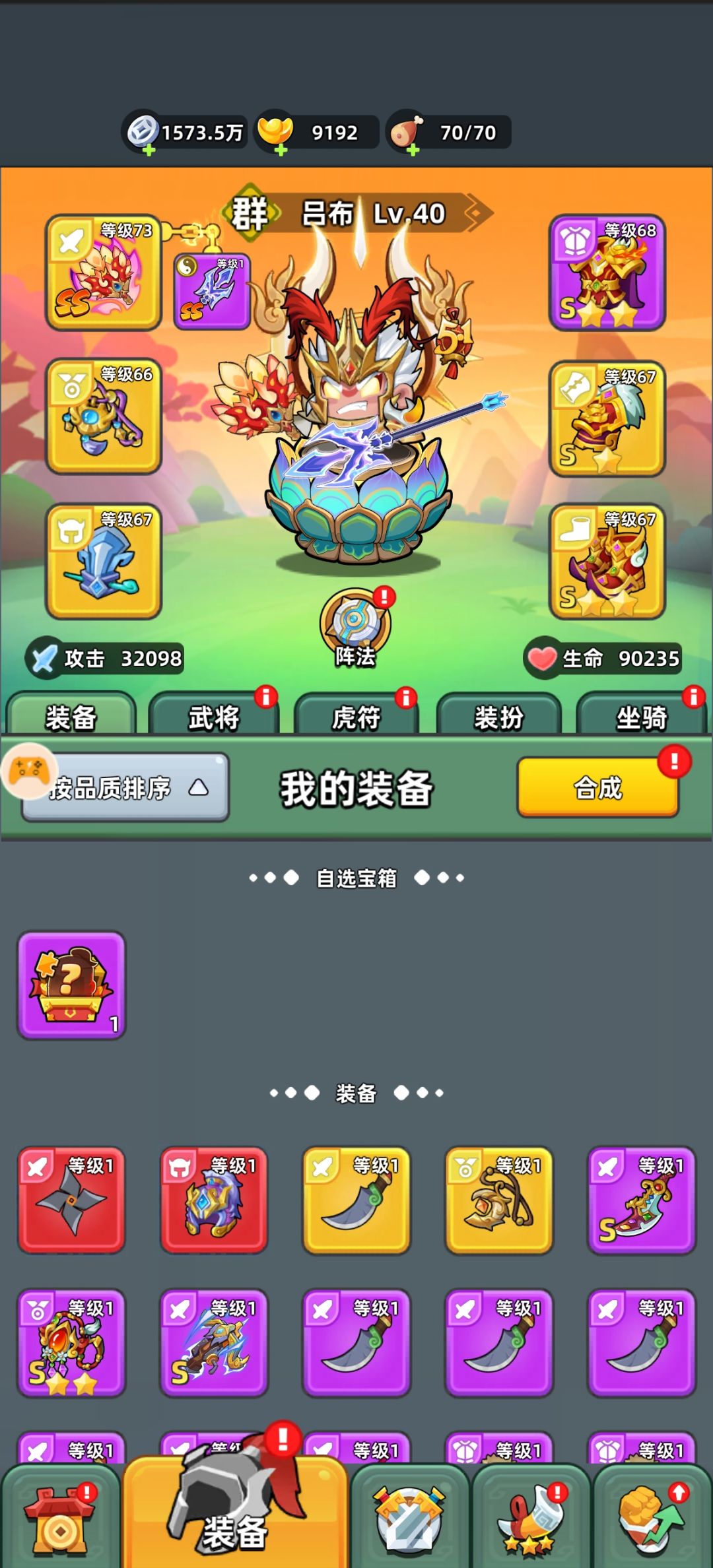 装备前期就合成战神,紫色升金色,不用担心金色不能置换的问题,后期天数够了金色也可以换,推荐天工➕连弩套,猛的一x,我现在双武器都没出来就73关了,坐骑推荐不停的抽大笨象,可惜我一直抽不出,只能用野猪过度,天赋优先点攻击力和火符,英雄推荐吕布,白板吕布也比5⭐孙尚香,5⭐貂蝉强太多,后期双武器可以带方天➕扇子刷图,单体伤害最高还是方天➕连弩。