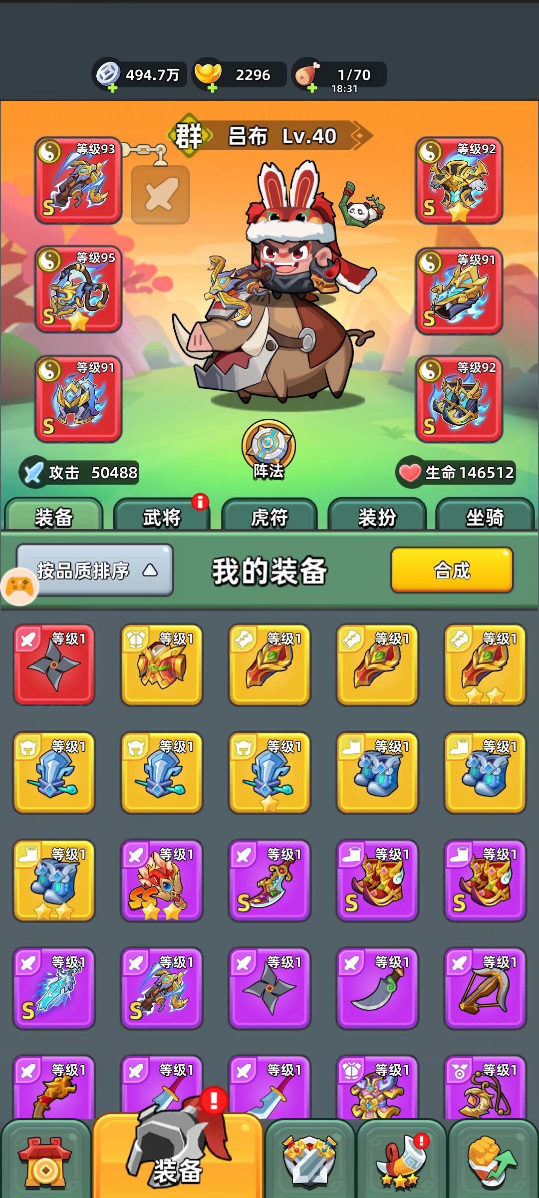感谢玩友们的支持~,声明一下,这个是在给定条件下的通关攻略,只是一种极限挑战的过程分享,并开发出游戏更多的可玩性。在卡关的时候可以尝试这样的打法。(本帖真实有效) 装备战力分析: 平平无奇,甚至有些拉夸,唯一亮点是黄扇。虎符基本全紫 ,坐骑一般,40级吕布还是够格的。但整体战力32000实属过低。 试了一把,勉强能清第一波线,一分钟过后就站不住了。按正常情况,这是个不可能通关的。不过本人是铁了心的