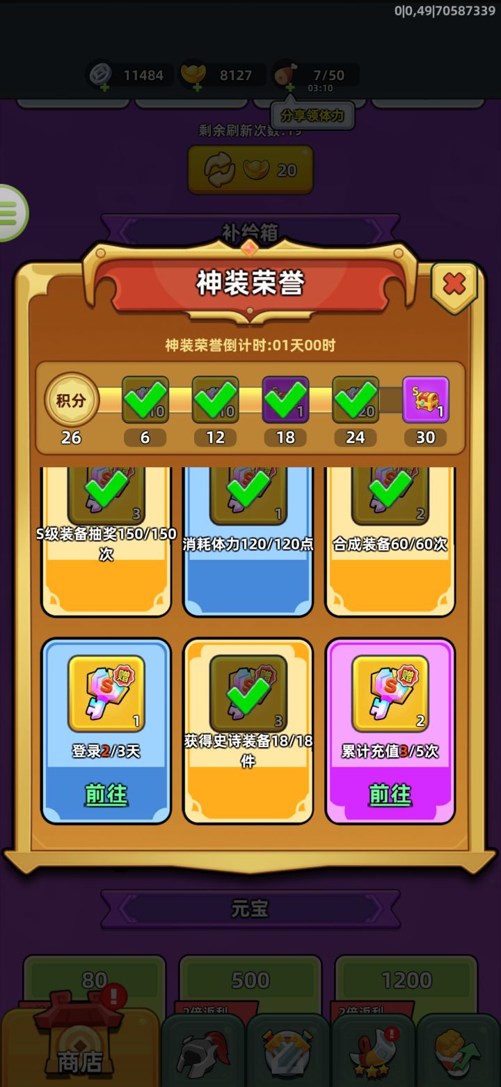 任务每天拉满,另外购买了43次耗费21500元宝,又成穷光蛋了。过程中抽到了两个紫S装备与各种其他紫装。下一步等兑换活动搞红头跟天宫链子。不知道有没有走错路。武器那么多也用不了,什么时候出个红武换红武,红弩直接换红寒冰多爽。