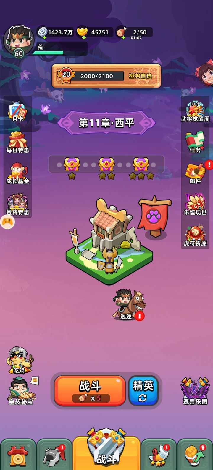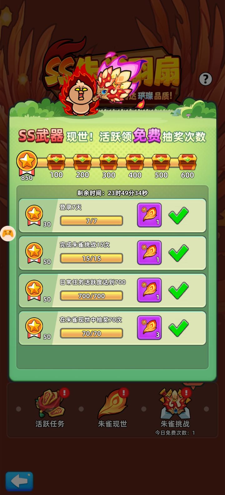 活越做满,扫荡满,加43个羽毛嫖到手。第50次抽的七星刀,赶上了以旧换新,换了一个诸葛连弩。紫色扇子被动技能是人参。特点是出手超快,体验感拉满,丝滑般过了精英10。