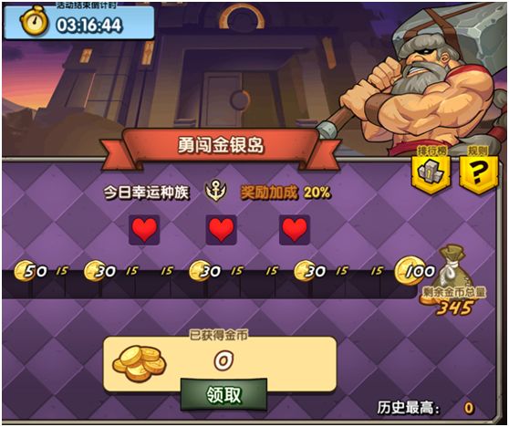 在1.3.0的版本中我们对金银岛的玩法做了很多调整,对金币收益大大增加,就让站长来带你们了解一下吧!游戏规则:每日三次生命,跟玩家对战。活动开放时间:周1—周5 每日8点、12点、20点(每次持续开放一个小时)1、3、6 、9胜之后会发现金矿,可以根据界面上的提示来选择加倍还是不加倍。奖励领取:1、当玩家生命值为0时,可领取当天获胜的奖励。2、获得12胜的全胜,可直接领取。3、生命值