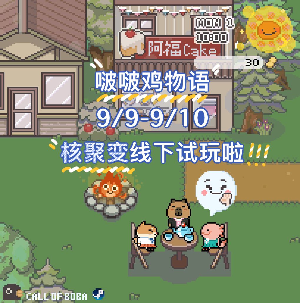 《啵啵鸡物语》将于9/9-9/10的北京核聚变游戏展开启第一次线下试玩啦!Taptap独立游戏展台--D41号展位,小鸡仔们等待感兴趣的玩家一起来玩耍!!展台准备了丰富的小奖品,期待大家的反馈和评价 如果能添加steam愿望单那就更棒啦!会有更多资讯\devlog更新滴 链接👉🏻https://store.steampowered.com/app/2342690/Call_Of_Boba/#游戏种草计划