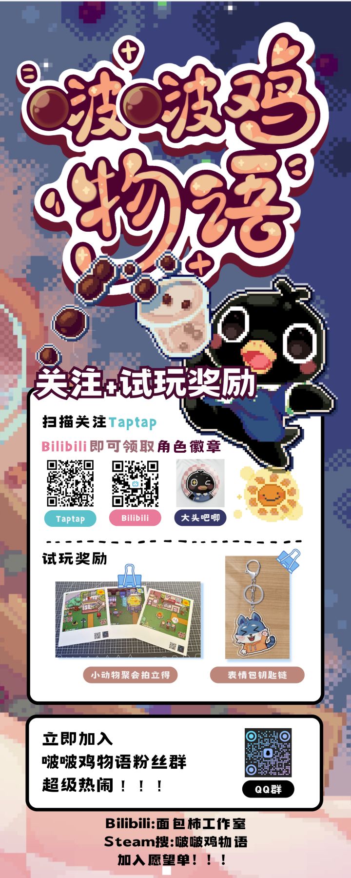 《啵啵鸡物语》将于9/9-9/10的北京核聚变游戏展开启第一次线下试玩啦!Taptap独立游戏展台--D41号展位,小鸡仔们等待感兴趣的玩家一起来玩耍!!展台准备了丰富的小奖品,期待大家的反馈和评价 如果能添加steam愿望单那就更棒啦!会有更多资讯\devlog更新滴 链接👉🏻https://store.steampowered.com/app/2342690/Call_Of_Boba/#游戏种草计划