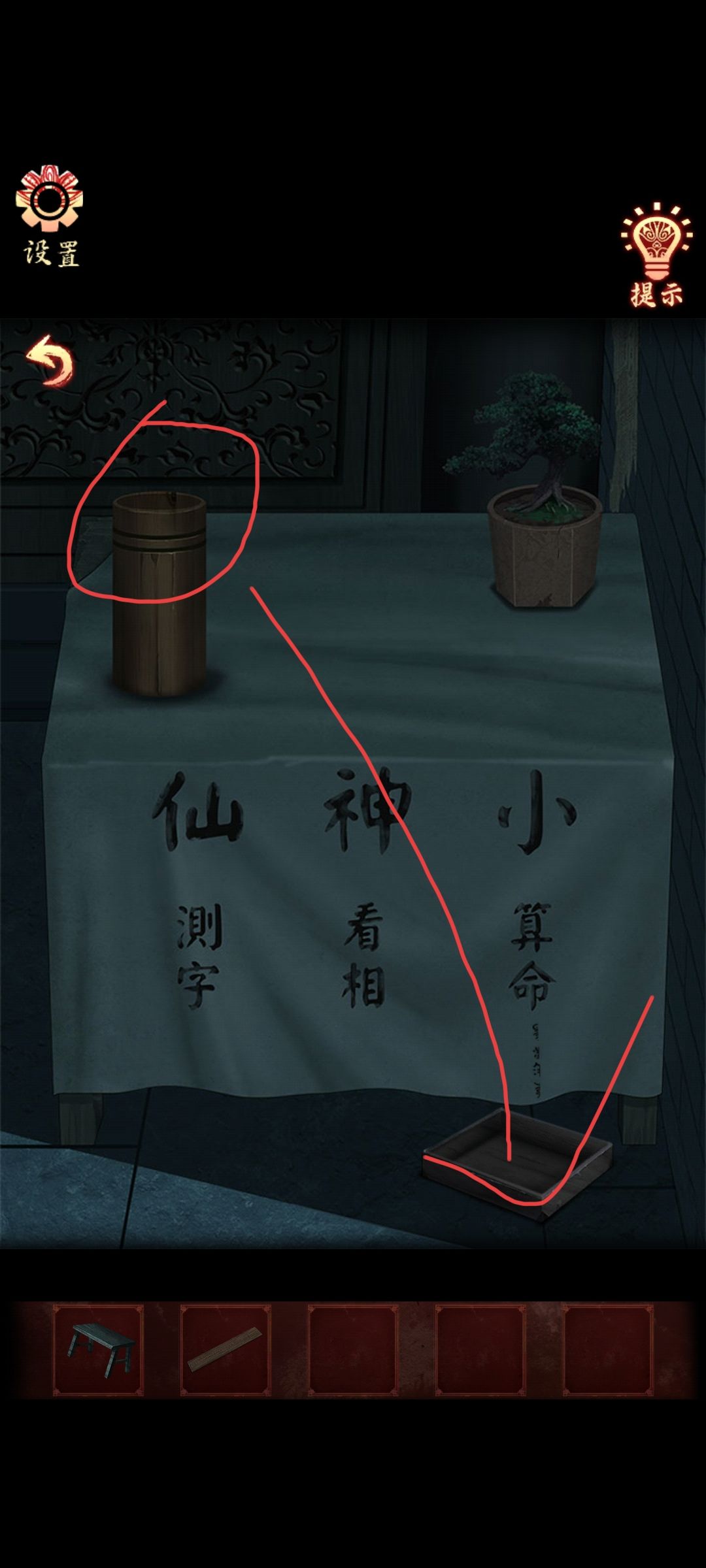 剧情过后查看一下算命摊子,先拿走前面小板凳发现后面是个鬼画符木箱,桌子上的卦签拿走,查看盒子界面点击左上角的一半符号使用卦签就能看到线索了,其实根据这一半就能调整好了,可惜系统不同意~调整完毕盒子打开拿到鲁班尺。 右边的架子上有两个司南的地方拿走勺子,然后在左边窗子下面使用小凳子,再点击窗子就能看到屋里了,查看一下桌子上的账本,怎么不是数字啊看不懂,后续还需要找线索,先用鲁班尺查看门栓就能开门进入