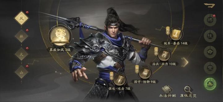 府邸升至15级后,则解锁兵法玩法。兵法入口在英雄培养界面。兵法分风、林、火、山四个象限,每个象限均可配置一本天书及四本兵法,玩家可以在书院中抽取以下是四象限的天书简介:某些英雄学某些技能有四围上的要求,因此可以通过天书提升英雄的四维。而兵法,则分为强攻、统军、固守、治兵,不同兵法带有不同的属性加成,例如提升前后军攻击、格挡、防御、兵力,又或是降低英雄受到的伤害等。建议是主升暴击和格挡,再兼顾
