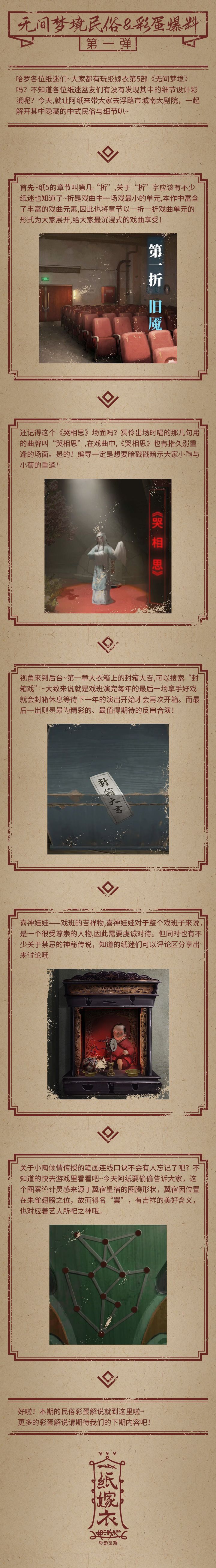 大家都应该玩过了纸嫁衣第5部《无间梦境》了叭~ 不知道各位纸迷盆友们有没有发现其中的细节设计彩蛋呢?今天,就让阿纸来带大家去浮路市城南大剧院,一起解开其中隐藏的中式民俗与细节叭~