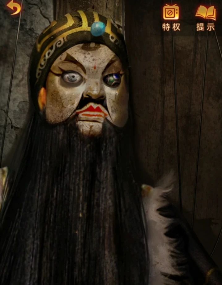 点击跳转: 👿帷幕中突然出现手臂,拖走陶梦嫣👿 10.右转到达戏台上。 👿右转戏台上有许多木偶👿 👿冥伶唱戏,梁少平木偶被砍头👿 拿到〔木偶头〕和〔长枪〕,返回大门处,将长枪交给钟梓萓,获得〔手机〕。 点击地上的洞口,将木偶头扔到木板最右端,拿到〔图钉盒〕。(图10) 11.进入戏台,点击左侧道具树,树洞内拿到〔小雕像·红色〕。 对挂在树上的布使用图钉,然后使用手机将图钉固定,树上出现暗门
