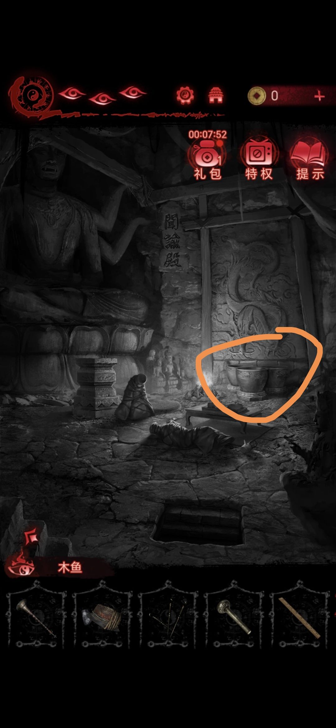 第四魇:迷失 1.(现代-岐白殿)点击地上的箱子,根据箱子上的提示,结合唐朝对人偶穴位印记使用鲁班尺后的线索,调整木块的位置(失脱、离乡、災至) 2.打开箱子,获得【木鱼】、【字块】和【花树钗】 3.(唐朝-闻谕殿)点击石雕,把【花树钗】插入她头上,获得【琉璃瓶】 4.(唐朝-浊门殿)点击桌子,用【火镰】点燃火柴,盖上【琉璃瓶】,触发剧情 5.点击左边的浮雕墙,把【字块】嵌入山字旁边的凹槽,获得线