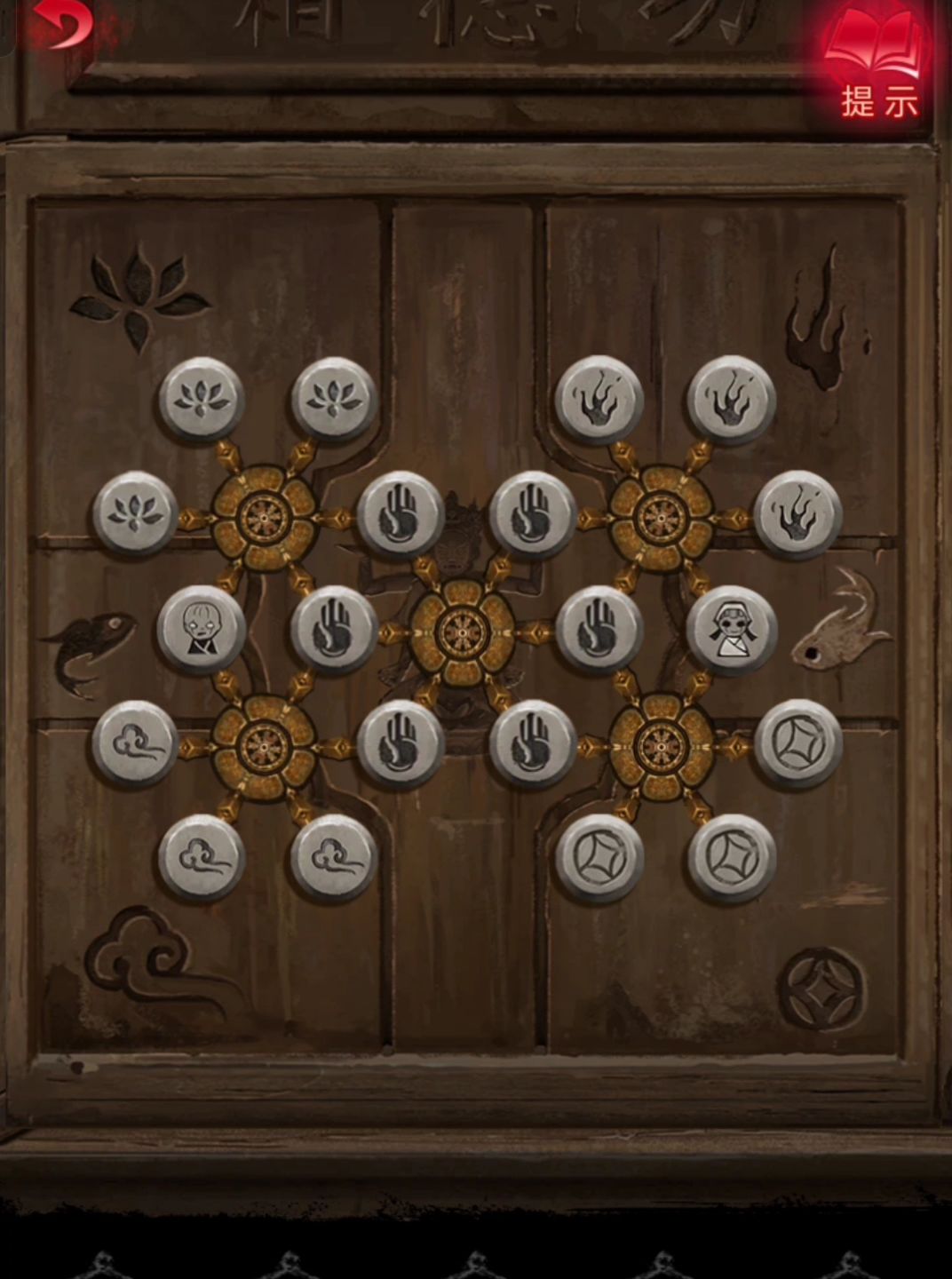 接上 将罗汉像传送至肖处,切换肖视角,获得罗汉像,将罗汉像放在房间右侧的金墩上,获得金雕寺庙或金秤砣 根据线索,可摆放左下方雕像方位,摆放完地道开启 进入地道,点击右侧书架,将寺庙金雕放在软垫上,获得咒符 点击左下方人群,将秤砣挂在称上 摘取墙壁上的火把,用火把把外面的庙点了,获得王相愿 点击中间的跪地雕像,获得弓箭 用弓箭插上咒符传送至奚处,切换奚视角,获得咒符 将咒符贴在庙里右侧的石人脸上,获