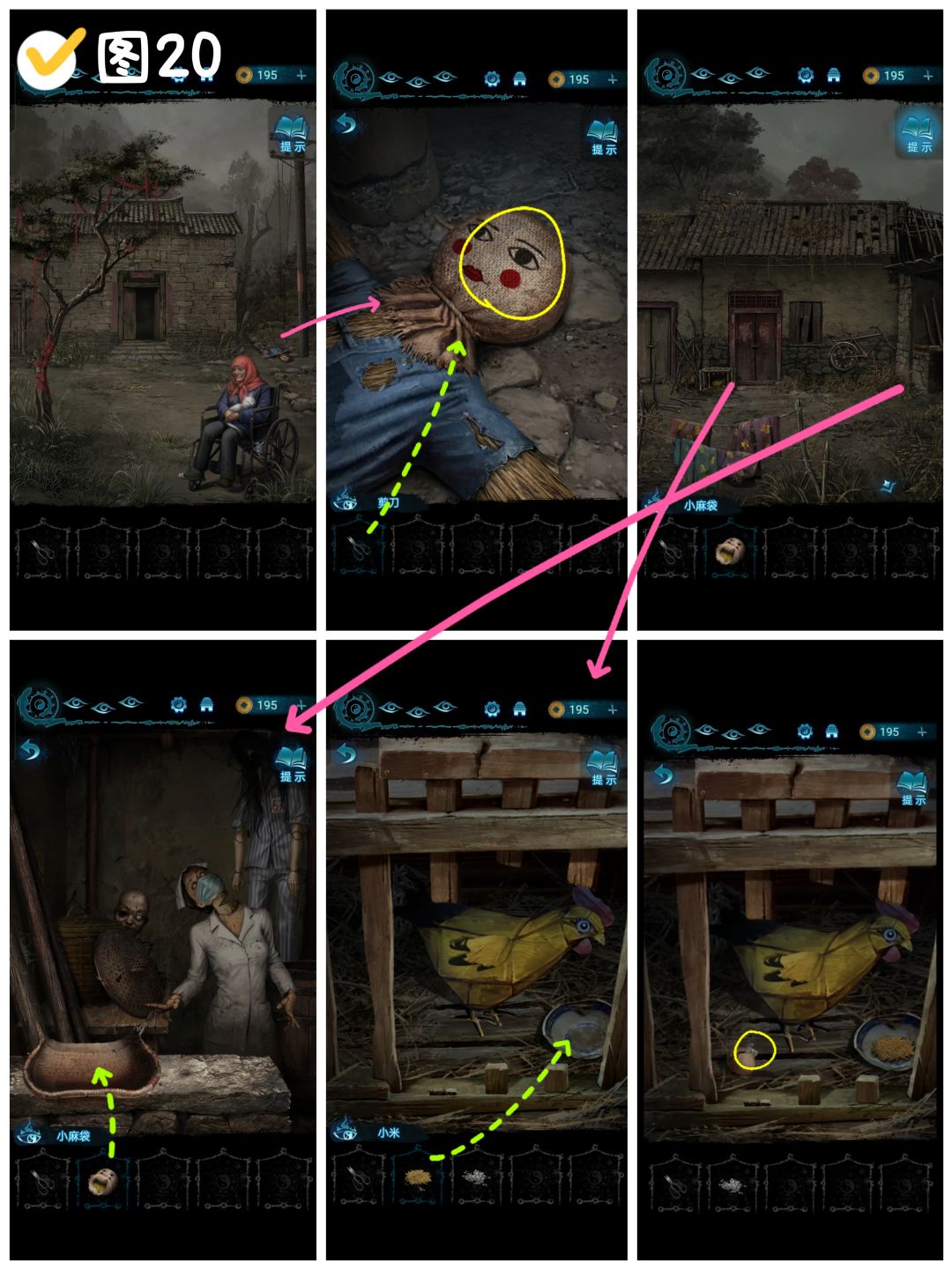 半成品,暂时只有字 抓周礼,除了罗盘,其余东西都可以抓,抓到剪刀即结束。 👿抓起剪刀,闪现恐怖病院场景👿 👿河对岸的小奚闪现成木偶👿 20.村口处,点击右侧电线杆下的稻草人,使用剪刀剪断绳子,拿到〔小麻袋(装有小米和砂石)〕。 点击大门进入院中,点击自行车右侧仓房 👿十三院三个木偶都在仓房👿 使用簸箕筛分小麻袋里的东西,拿到〔小米〕和〔砂石〕。 点击院中的鸡笼,将小米放入碗中,小鸡下蛋,蛋壳内拿到