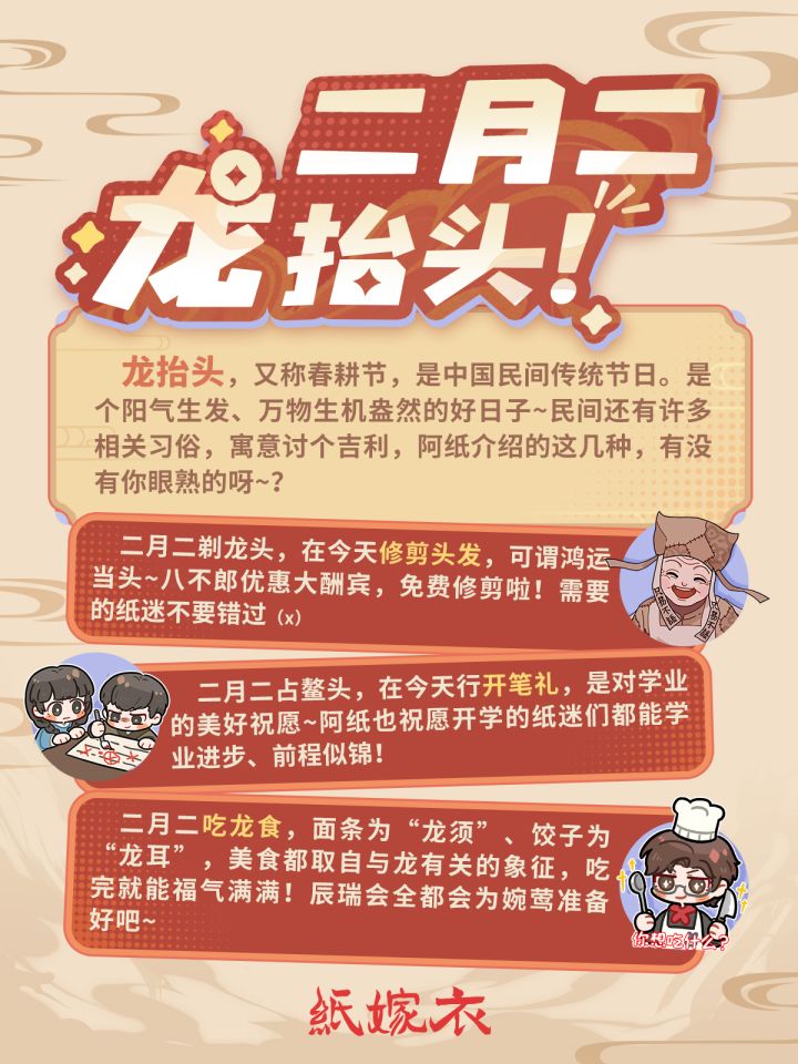俗话说“二月二新雨晴,草芽菜甲一时生”,传说二月二是龙王降雨、用于滋润万物,种子萌发的日子~人们也以此祈求风调雨顺、纳祥转运。纸迷们的家乡有哪些有关“龙抬头”的小习俗呀~?欢迎在评论区分享!阿纸也邀请了几位特别嘉宾为大家做小讲解~来来来,坐好小板凳~纸嫁衣民俗小课堂开课啦!