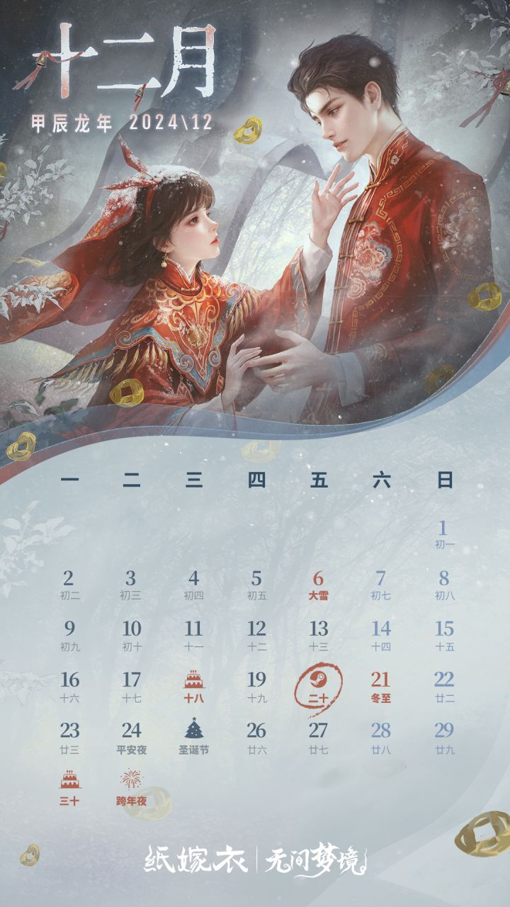 冬月马上就到啦~阿纸又带来了新的日历,一如既往地含有超大杯彩蛋信息哦嘿嘿!虽然有寒风魔法与物理的混合攻击,不过这个冬天依旧有阿纸陪伴在大家身边~希望纸嫁衣可以为大家带去快乐呀(点头)(确信)