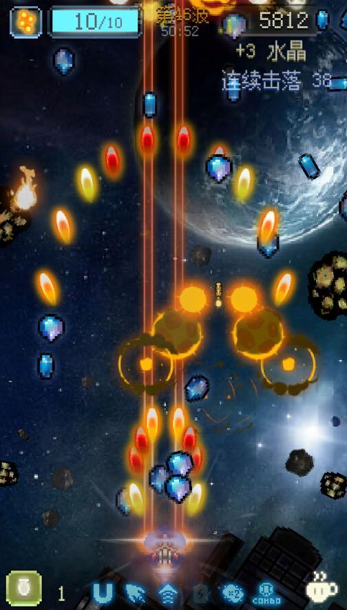 1.新增飞船:翡翠 2.新增飞船:蝠鲼,取代原来战斧,达到4000分可以使用 3.新增特殊武器:穿甲弹 4.武器:震撼弹的伤害范围增加 5.武器:散弹数量增加 6.武器:聚能炮增加对中型敌机的秒杀机制 7.飞船撞击敌人不再被连续丢失火力,且有3秒无敌时间 8.调整了导弹类攻击对小型壁垒、陨石等障碍物体造成更多伤害,并具有aoe 9.设置加入了虚拟摇杆操作 10.缩短波数之间的时间,加快游戏节奏 1