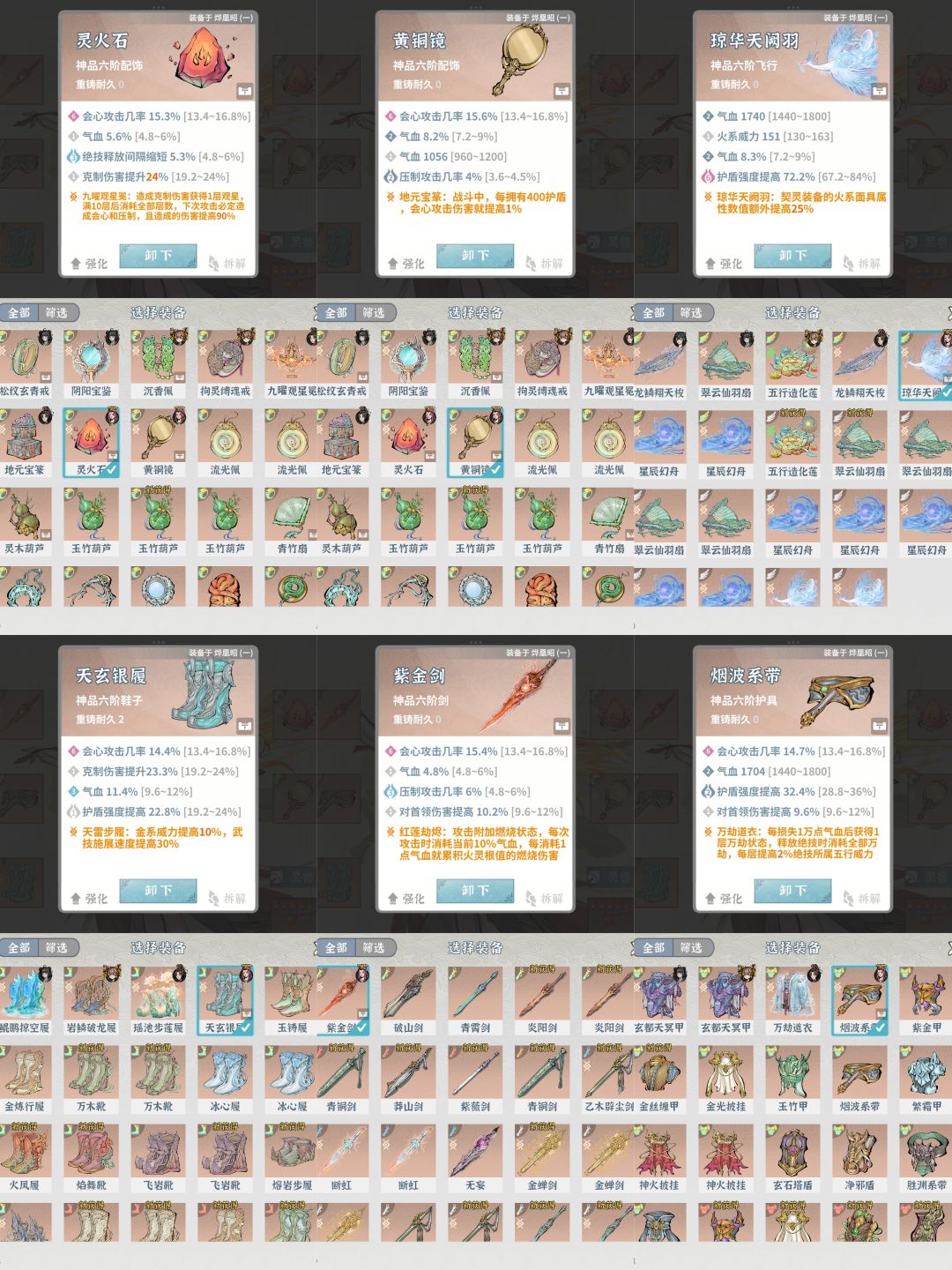 装备会心四橙一蓝,我也有两件粉的,鞋子和饰品,但是其他词条不太行,先这样用着吧[表情_开心] 装备升品推荐,会心会伤克制首领伤,灵力集气次选,只升会心可能升到粉色的,如果歪了一次就及时止损,如凡品会心蓝色起升,如果升到紫色会心则继续,再升到橙色再继续,否则不继续升了,当然凡品紫色会心升更好,推荐升百分之九十以上会心的,如凡品蓝色会心推荐8.7起步升,太低了不推荐升