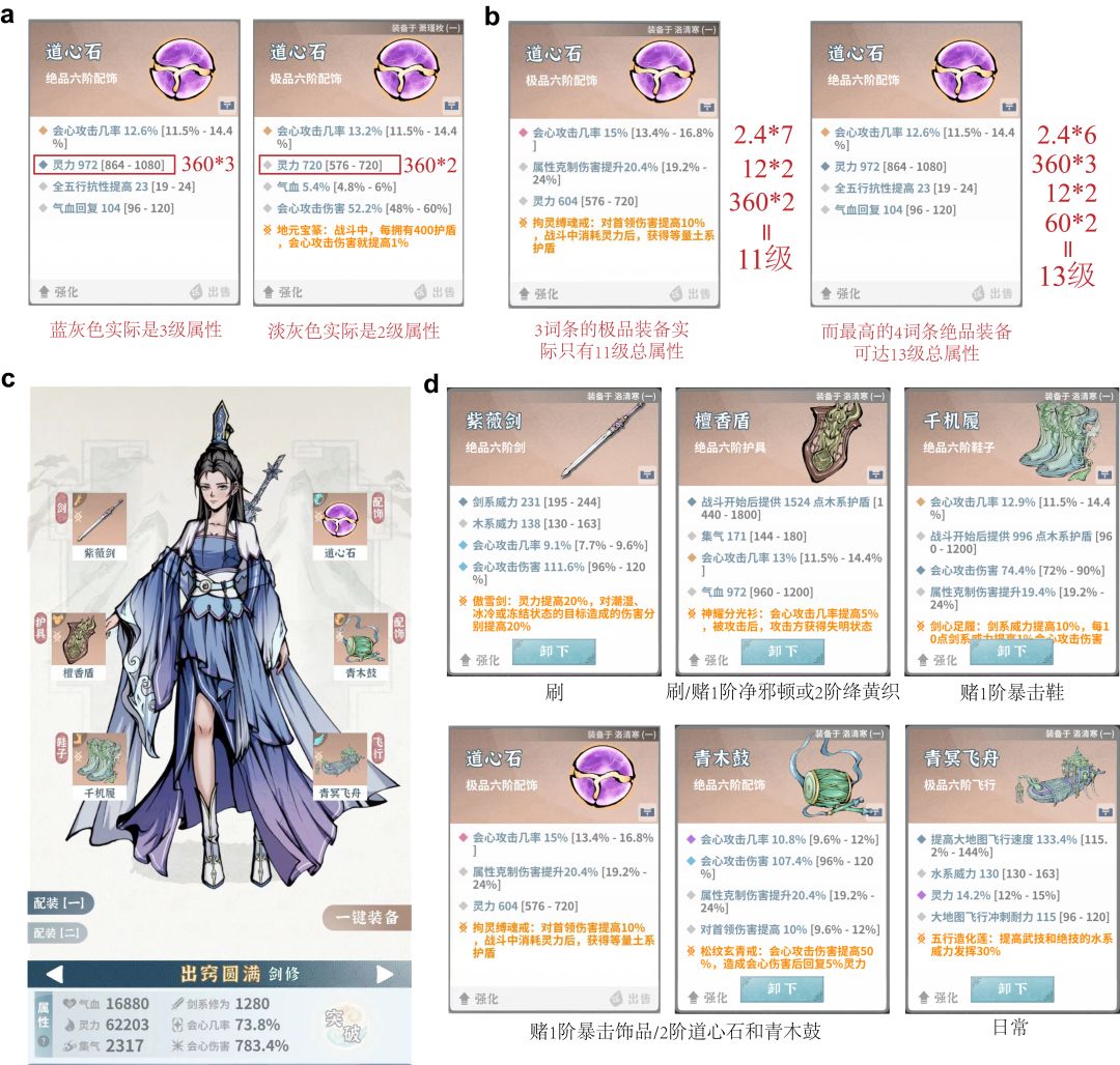 上次发布了新水剑千万秒伤的视频(详见我的历史帖子),有朋友咨询装备情况,这里以水剑为例,对装备属性进行详解。先说一些基础问题,最低等级的淡灰色词条实际上并不是1级属性而是2级属性(图a),所以3词条的装备实际上亏了1级属性,而最高的四词条6阶绝品装备有13级属性,三词条的极品则只有11级属性(图b)。 先看一下我的水剑的整体情况(图c),具体属性权重分析如下:由于本作暴击伤害比较廉价,因此暴击率