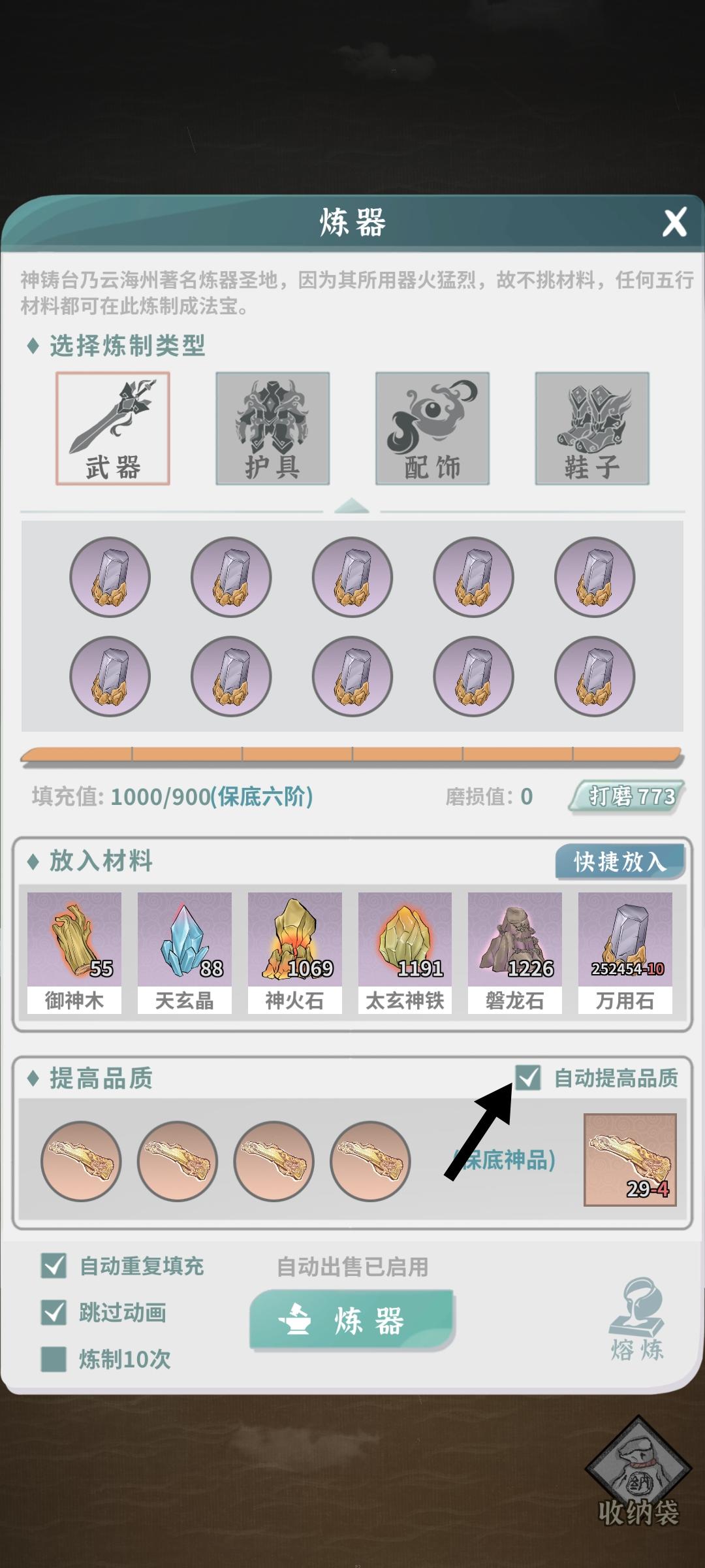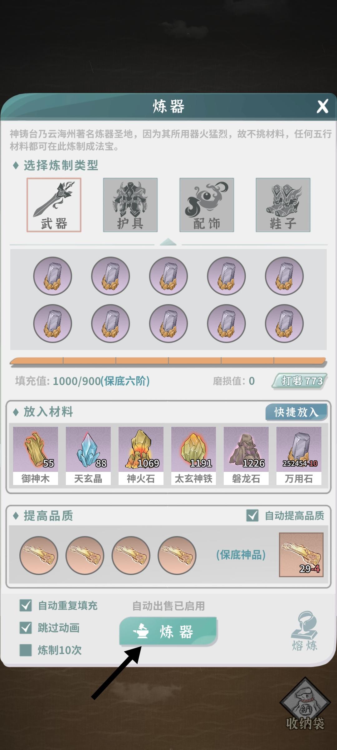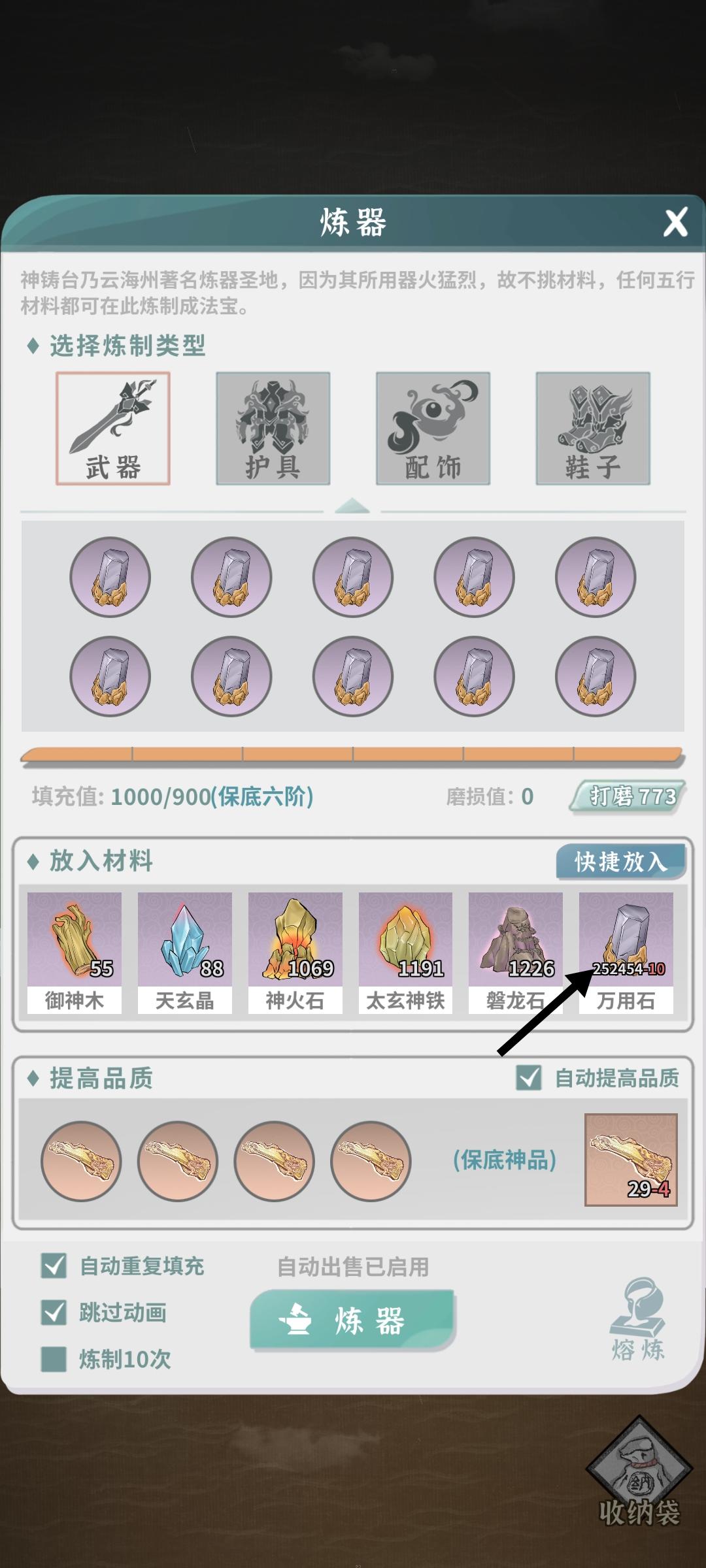 除了每日副本会掉落神品法宝,还有两种获得神品法宝的方法。第一种就是锁妖塔用引妖香刷梦魇十一及以上的难度。第二种就是在神铸岛这里,熔炉制造万用石,用升阶石换天工残片,然后来神铸台,放入万用石,勾选提高品质,开砸。(分解器纹也能获得天工残片)砸完多次后,需要打磨,这样能保证一直出神品法宝。