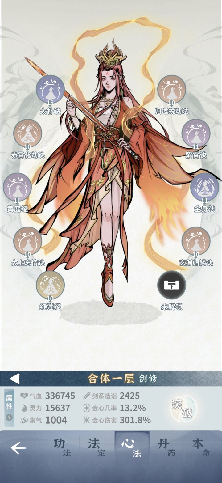 第一次玩这个游戏,开局借鉴了攻略区的单火剑开局,但是渡劫篇没有讲解如何处理古钟副本(多眩晕),也没有养其他角色解控(青龙衣),很多人就会卡在古钟!这篇攻略的意义在于,可以使血抗火剑快速过渡,直达龙宫后慢慢转会心流,养成更为平滑。核心思路:1、保证大招cd缩减85以上;2、心法:金芒术(失明)+幻花诀(禁足)。3、铃铛饰品(可选)+藤龙缚心诀(可选)4、一倍速