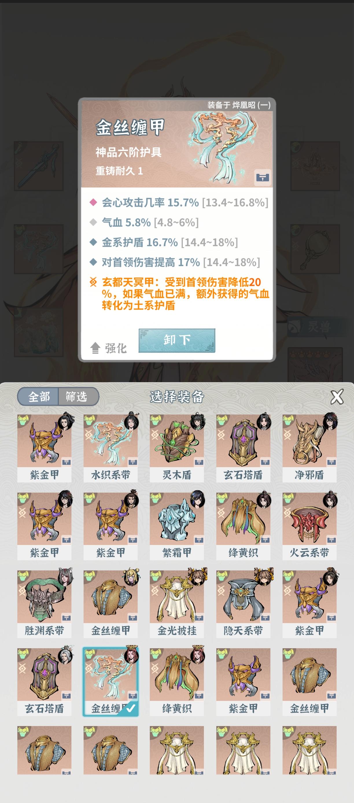 更新初期就有大佬测试金犀,看起来不是攻击但是属于造成伤害一类,那时觉得和契灵很像没多想,这几天整活中,金气已经过主线龙宫,然后发现主手契灵器纹直接让金犀伤害变成3倍,去梦魇塔表现也不俗,拉去龙主试炼以金气为例模拟一组数据:(反伤金锤,反伤大师姐,反伤土枪也会变强3倍)反伤金气反伤伤害:基础伤害:520万会伤:135克制:15或8压制:11.2*1.3=14.56或0.6