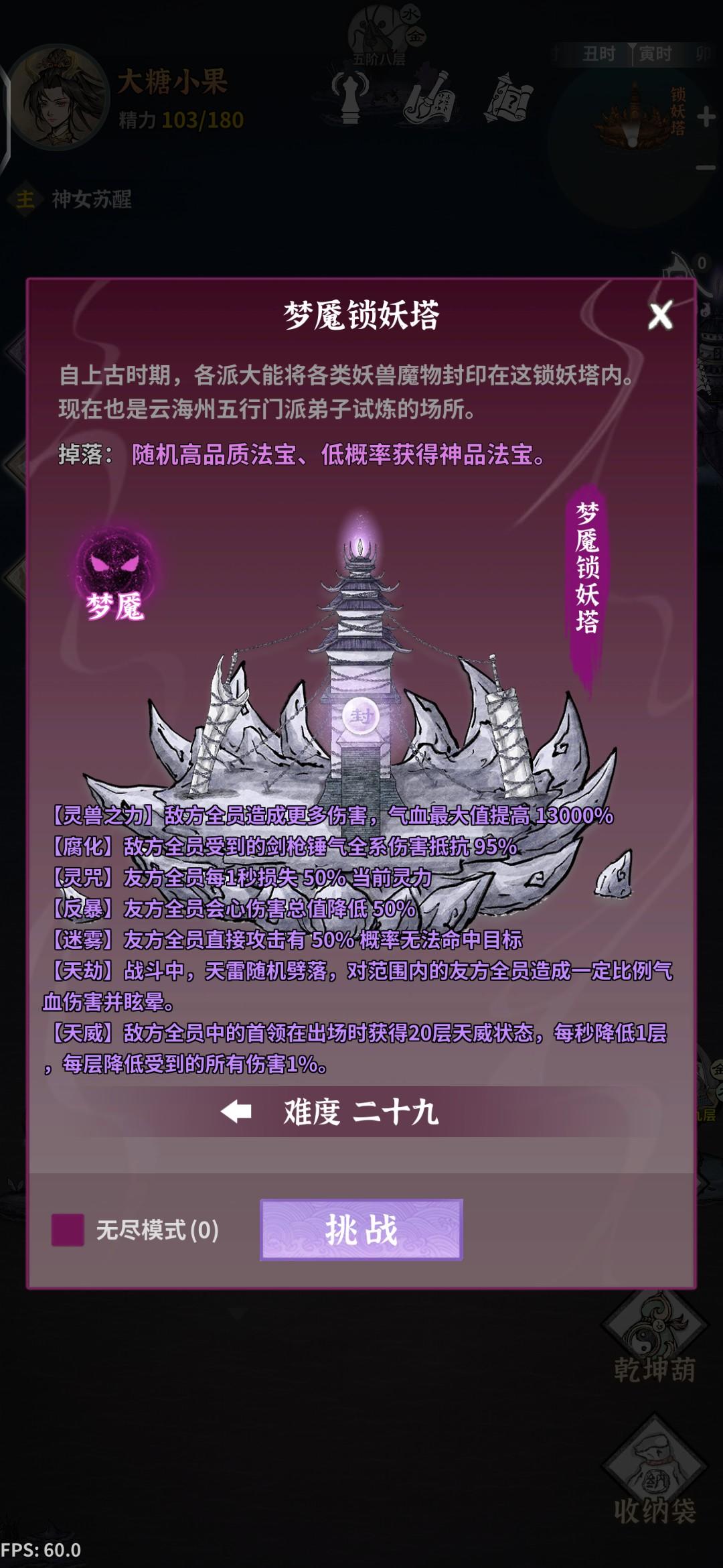 问:如何省紫灵石与龙脉石?答:把神宝引妖香炉升到满级,来锁妖塔刷梦魇十一,前期的神品法宝几乎都从这里获得。经过记录天数测试数量,刷梦魇高层出的神品法宝明显更多,刷梦魇十一100波每天平均获得4件神品法宝,刷梦魇二十九100波每天平均获得8件神品法宝。刷出来的神品法宝,有一些一开始就能获得不错的词条,最高级词条对上了洗一洗,很容易就能获得一件能用的法宝。最高级词条不出,紫灵石就攒着,等着后面再用,