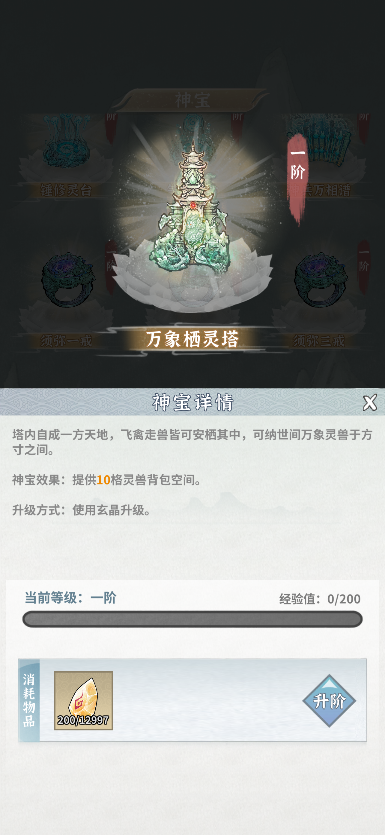 道友好,关于装备升阶,为避免大家误解,在此做出详细说明:【升阶条件】需完成天陨归墟后续主线对话任务。需要升阶的法宝必须是六阶神品。【升阶消耗】六阶神品法宝升阶到七阶有基础消耗,为10个仙阙灵沙(新版本道具,从莲华道晶兑换的新宝盒获取),10个升阶石和10个天工残片。另外有两个可选升阶项,见图:【升阶结果】升阶后,所有词条都会得到基础阶带来的提升。并获得一次随机词条升级机会(请注意,如