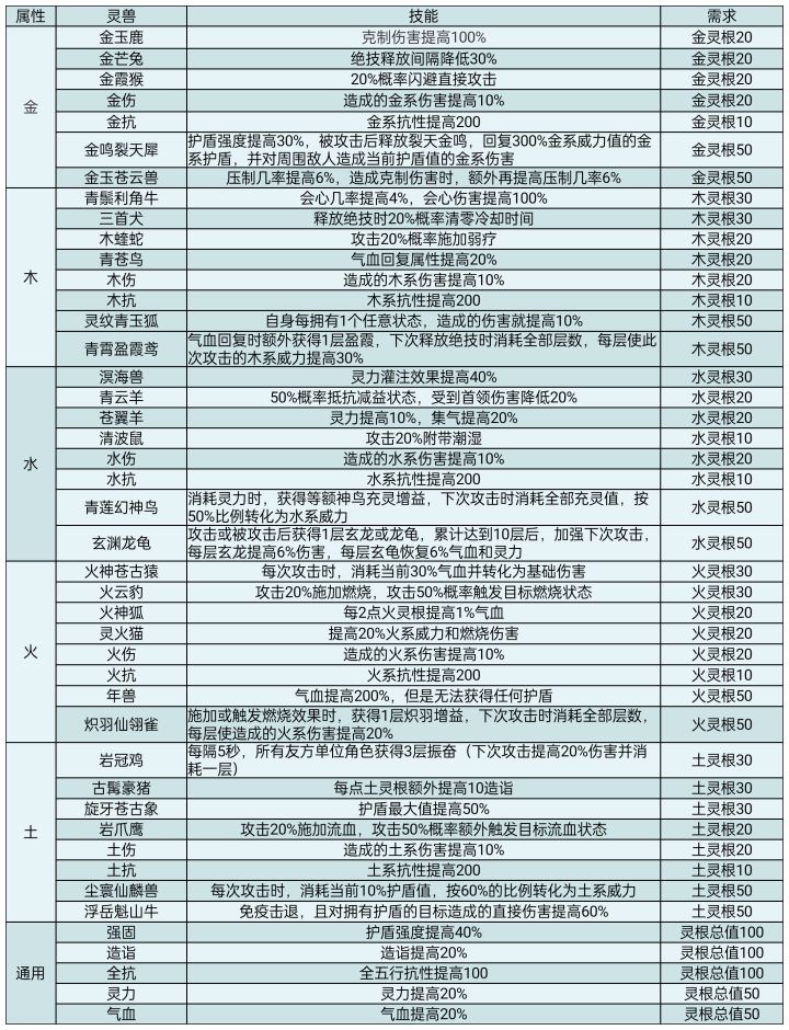 灵兽技能和天赋大全