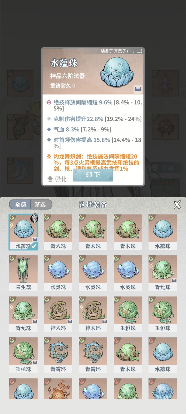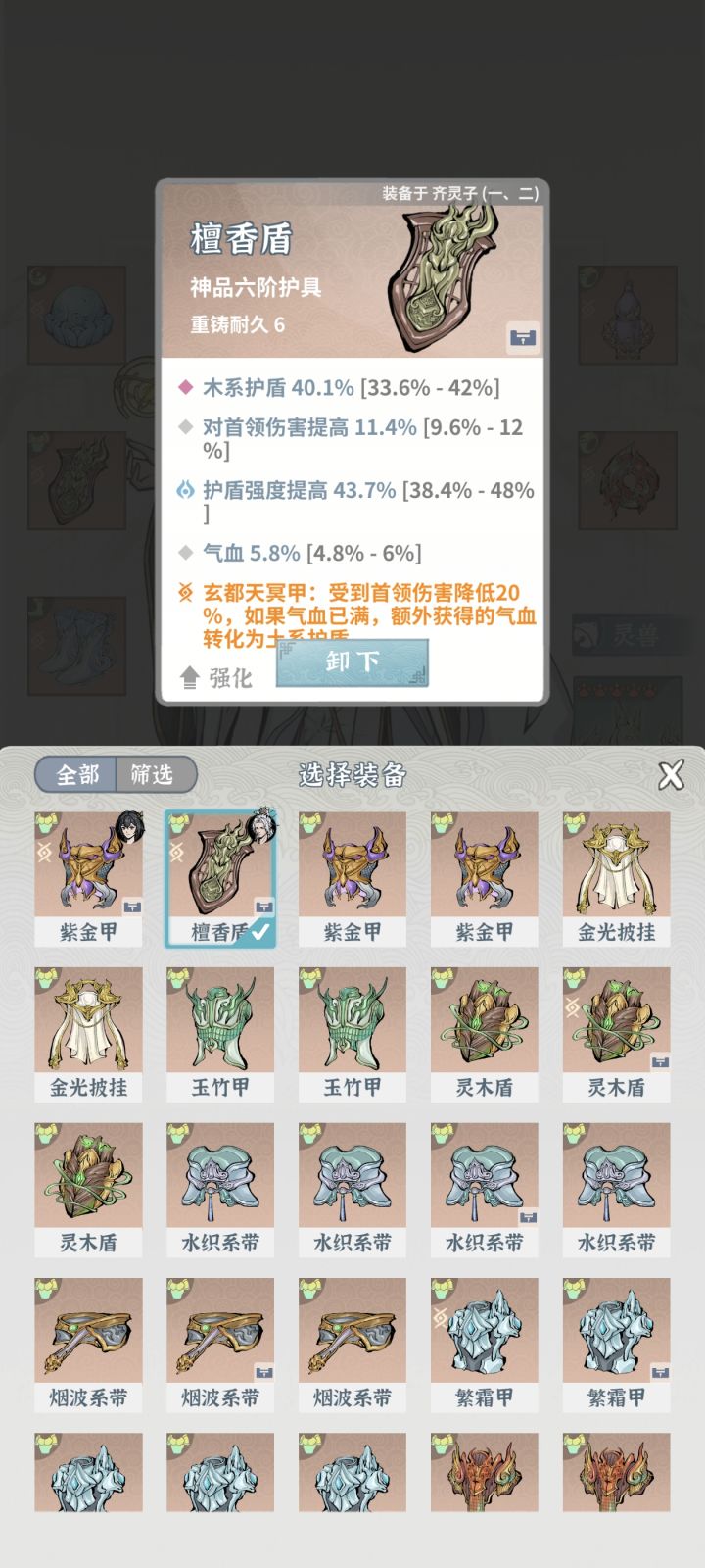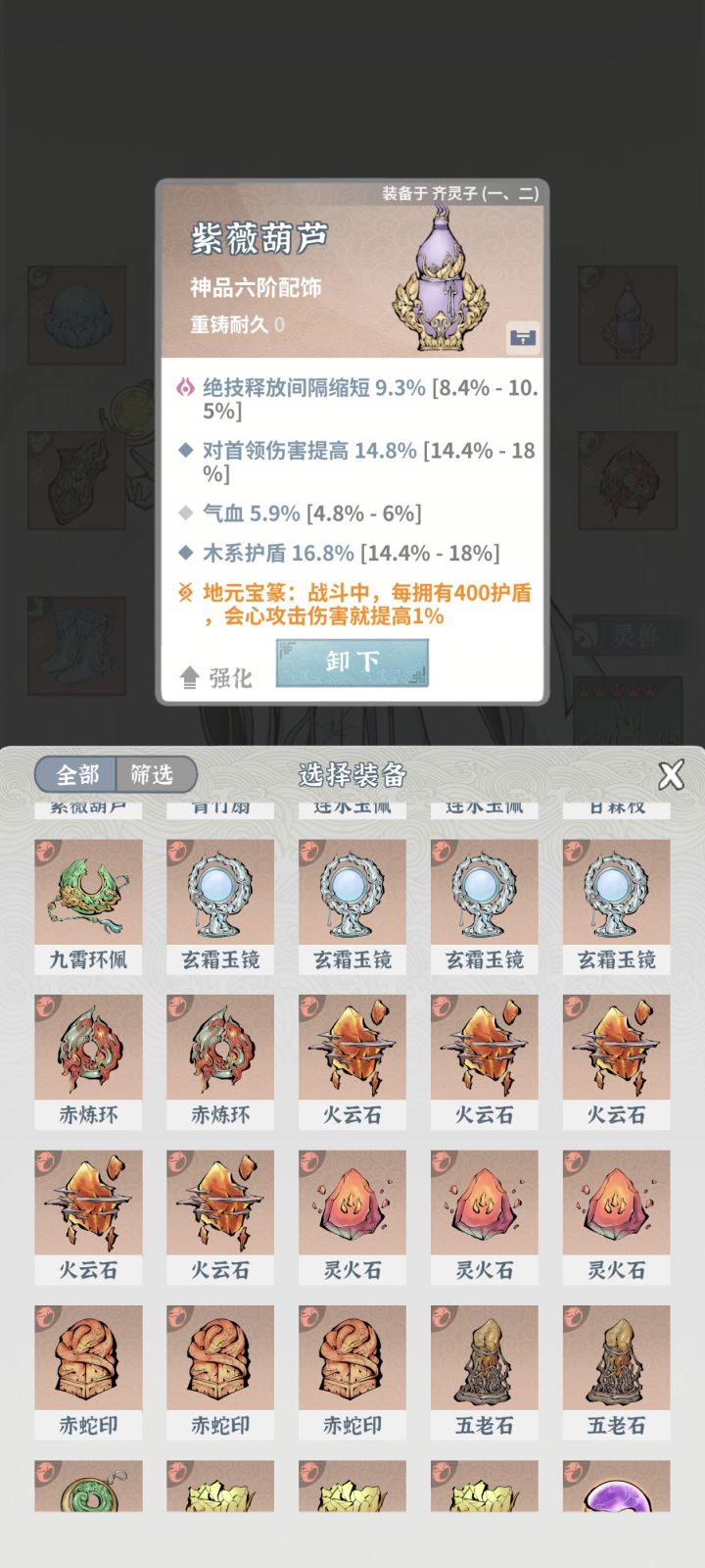 木奶法宝器纹:乙木辟邪剑、玄都天冥甲、岩鳞破龙履、阴阳双鱼珏、拘灵缚魂戒、翠云仙羽扇法宝词条选择:灵力%、气血%、金木水火土系护盾、气血回复、固定气血契灵:丑牛面具:丑牛、午马、亥猪、未羊