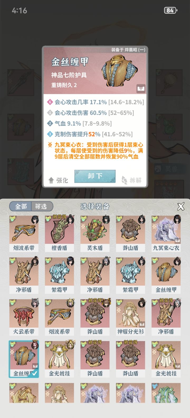 以上配置,思路说不出来,总之,穿上这一身我发现很多以往觉得要洗的属性全都不重要了,心法格子也有大量位置可以换各类配置,总之,怪对老登的伤害在金犀的回盾量之内就能狠狠拉扯,龙七也可以单独站住,就是没CD打不赢,队友选择在考量中,但是感觉只有气靴一个乘区收益高了。乐意玩老登的自行斟酌选用。总之,除了金威CD盾强,感觉什么属性都不太需要了,很空虚。这套就叫空虚老登吧。