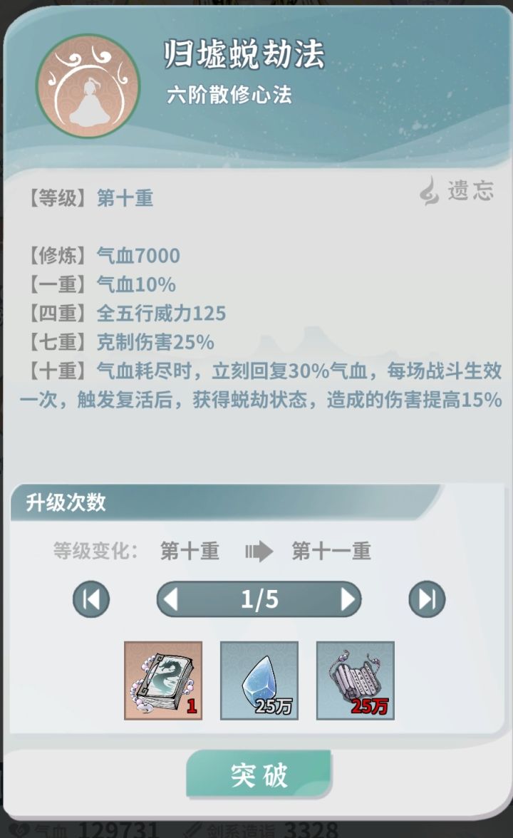 第一次玩这个游戏,开局借鉴了攻略区的单火剑开局,但是渡劫篇没有讲解如何处理古钟副本(多眩晕),也没有养其他角色解控(青龙衣),很多人就会卡在古钟!这篇攻略的意义在于,可以使血抗火剑快速过渡,直达龙宫后慢慢转会心流,养成更为平滑。核心思路:1、保证大招cd缩减85以上;2、心法:金芒术(失明)+幻花诀(禁足)。3、铃铛饰品(可选)+藤龙缚心诀(可选)4、一倍速