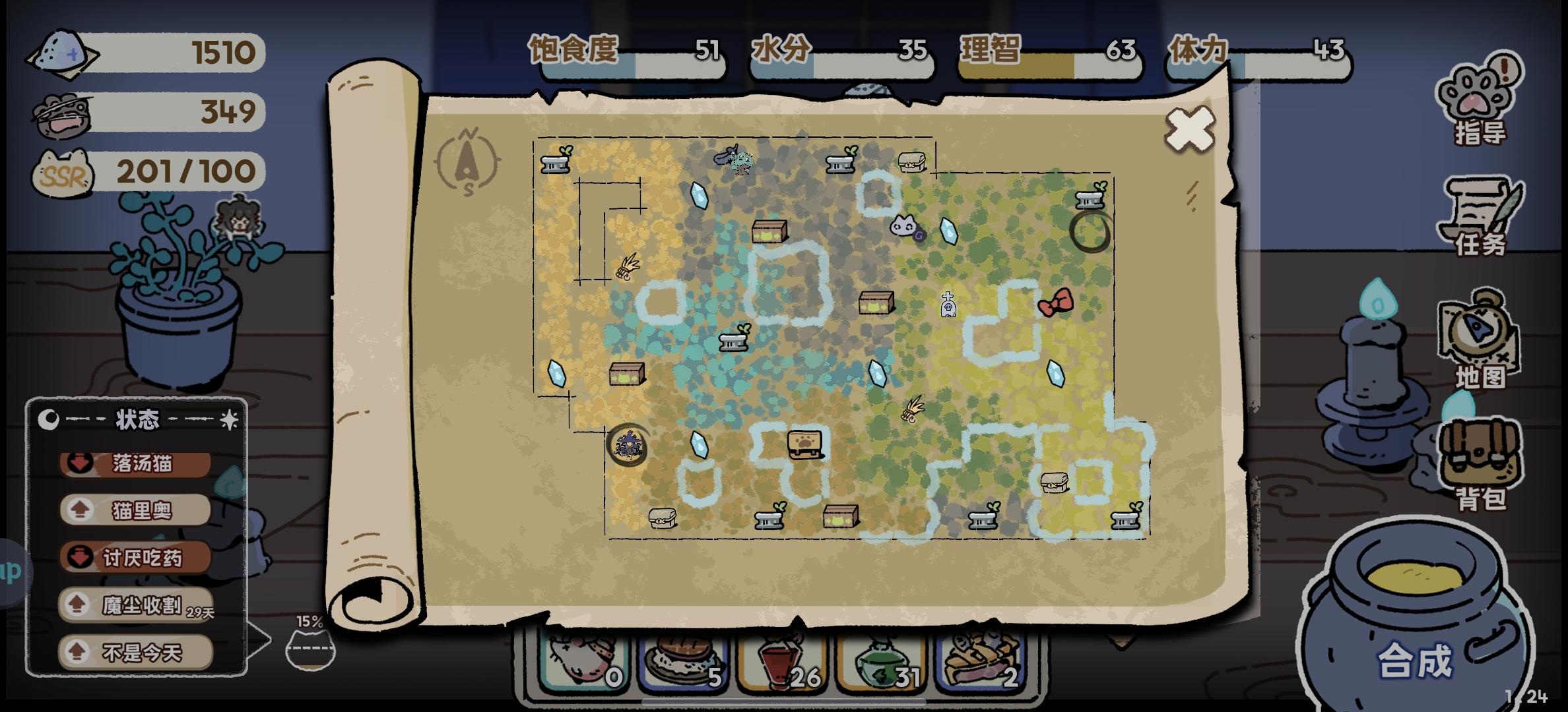 摸不好玩法可能会比较焦虑,净看生存值了,但小猫咪睡觉能回体力,探索能回san值,平衡好消耗就行,当小猫想吃鱼的时候喂鱼会大大提高san值,新手引导有进步,挺有意思的,点贴图就可以了